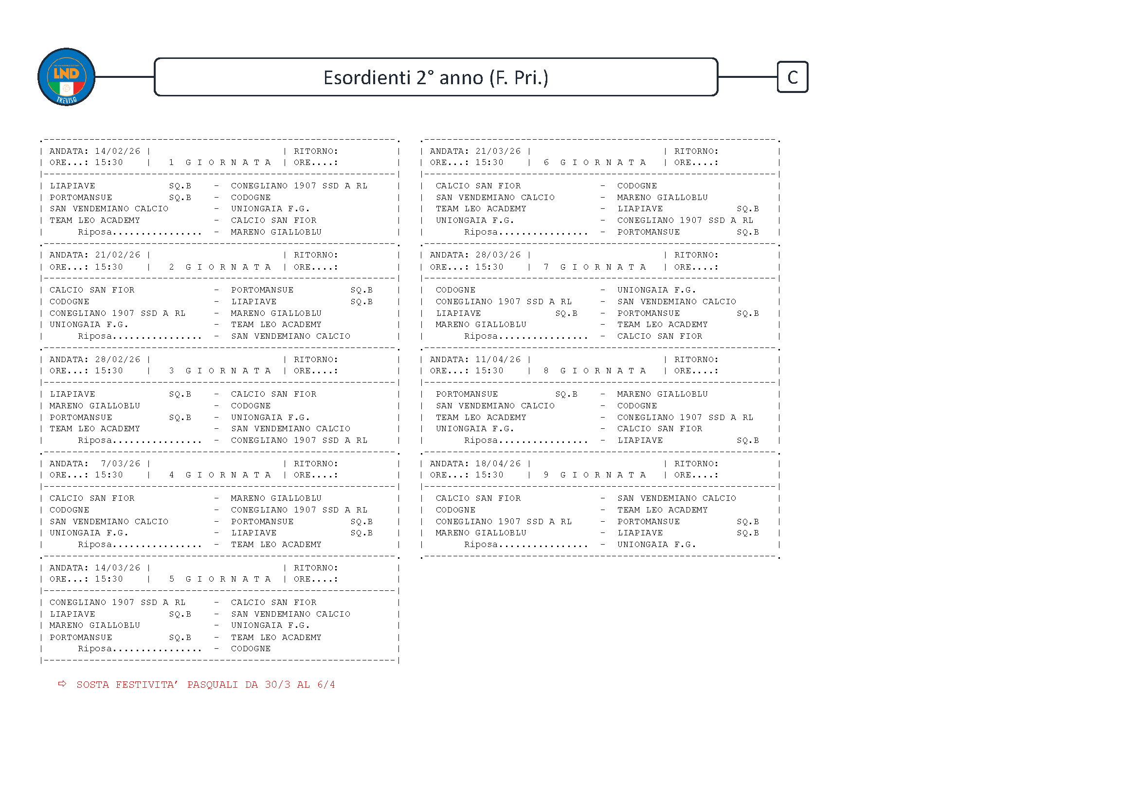 1a Sab 14/02/26 (15:00) SAN VENDEMIANO CALCIO - UNIONGAIA Lun 23/02/26 (18:00)